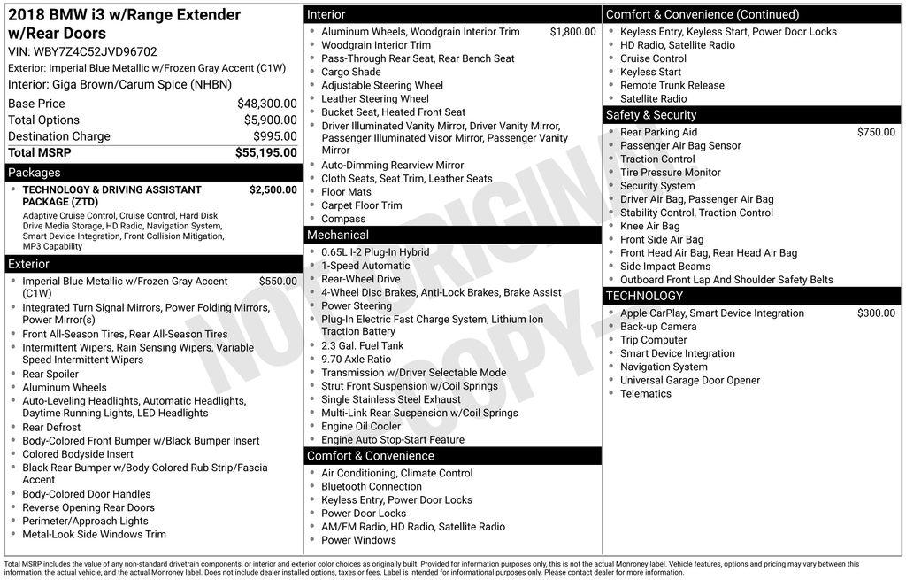 4 Speakers, 4-Wheel Disc Brakes, ABS brakes, ACC Stop & Go + Active Driving Assistant, Advanced Real-Time Traffic Information, Air Conditioning, Alloy wheels, Apple CarPlay Compatibility, Auto-dimming door mirrors, Auto-dimming Rear-View mirror, Automatic temperature control, Brake assist, Bumpers: body-color, Cloth Upholstery, Compass, ConnectedDrive Services, Delay-off headlights, Driver door bin, Driver vanity mirror, Dual front impact airbags, Dual front side impact airbags, Electronic Stability Control, Emergency communication system: BMW Assist eCall, Exterior Parking Camera Rear, Four wheel independent suspension, Front anti-roll bar, Front Bucket Seats, Front Center Armrest w/Storage, Front reading lights, Fully automatic headlights, Garage door transmitter, Giga Leather/Cloth Interior, Giga World, HD Radio, Heated Front Seats, Heated front seats, Illuminated entry, Knee airbag, Leather steering wheel, Light Eucalyptus Wood Trim, Low tire pressure warning, Natural Leather/Cloth Upholstery, Navigation System, Occupant sensing airbag, Outside temperature display, Overhead airbag, Panic alarm, Park Distance Control, Passenger door bin, Passenger vanity mirror, Power door mirrors, Power steering, Power windows, Radio data system, Radio: FM, Rain sensing wipers, Rear window defroster, Rear window wiper, Remote keyless entry, Security system, SiriusXM Satellite Radio, Smoker's Package, Speed control, Speed-sensing steering, Speed-Sensitive Wipers, Split folding rear seat, Spoiler, Steering wheel mounted audio controls, Technology & Driving Assistant Package, Telescoping steering wheel, Tilt steering wheel, Traction control, Trip computer, Turn signal indicator mirrors, Variably intermittent wipers, Wheels: 19" x 5.0" Front & 19" x 5.5" Rear Giga, Wheels: 19" x 5.0" Front & 19" x 5.5" Rear Tera.