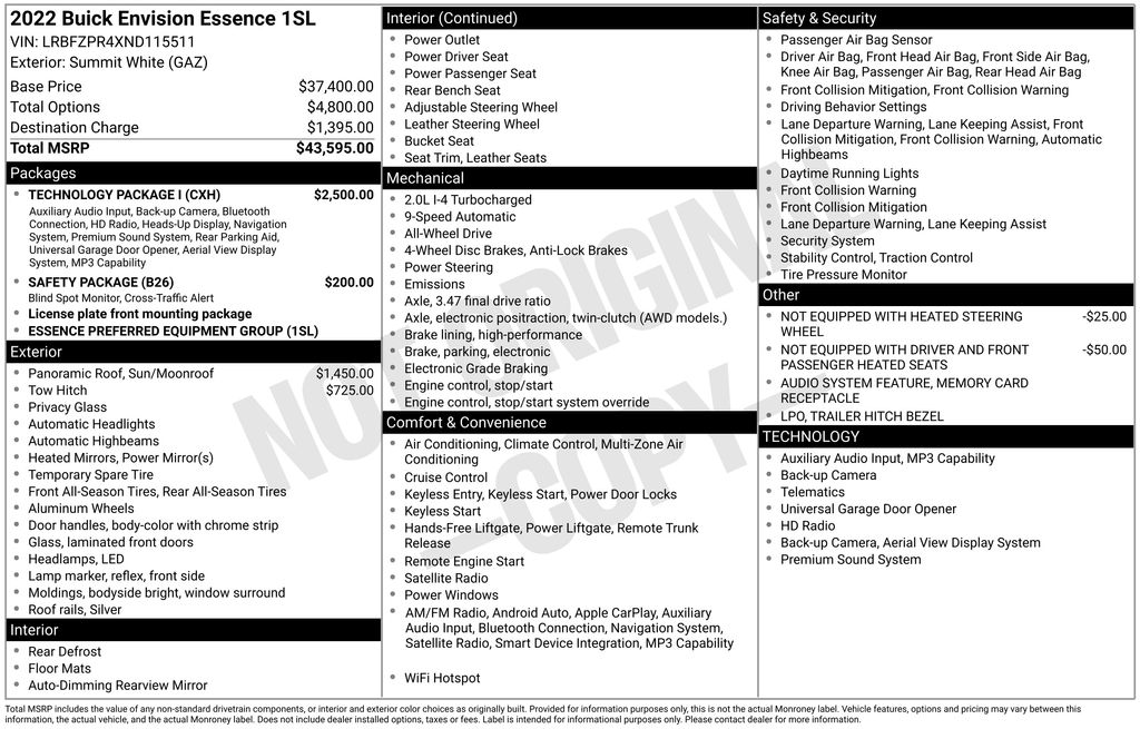 Clean CARFAX. CARFAX One-Owner. 3-Channel Programmable Universal Home Remote, 3.47 Final Drive Axle Ratio, 4-Wheel Disc Brakes, 7 Speakers, 7-Speaker Audio System Feature w/Amplifier, 8-Way Power Driver Seat Adjuster, ABS brakes, Air Conditioning, Alloy wheels, AM/FM radio: SiriusXM, Apple CarPlay/Android Auto, Auto High-beam Headlights, Auto-dimming door mirrors, Auto-dimming Rear-View mirror, Automatic temperature control, Bose Premium 9-Speaker Audio System Feature, Brake assist, Bumpers: body-color, Compass, Delay-off headlights, Driver door bin, Driver vanity mirror, Dual front impact airbags, Dual front side impact airbags, Electronic Stability Control, Emergency communication system: OnStar and Buick connected services capable, Four wheel independent suspension, Front & Rear Park Assist, Front anti-roll bar, Front Bin Center Console USB Ports, Front Bucket Seats, Front Center Armrest, Front dual zone A/C, Front Passenger 8-Way Power Seat Adjuster, Front reading lights, Fully automatic headlights, HD Radio, HD Surround Vision, Head-Up Display, Heated door mirrors, Heated Driver & Front Passenger Seats, Heated front seats, Heated Steering Wheel, Heated steering wheel, Illuminated entry, Knee airbag, Lane Change Alert w/Side Blind Zone Alert, Low tire pressure warning, Memory Card Receptacle Audio System Feature, Memory seat, Not Equipped w/Driver & Fr Passenger Heated Seats, Not Equipped w/Heated Steering Wheel, Occupant sensing airbag, Outside temperature display, Overhead airbag, Overhead console, Panic alarm, Passenger door bin, Passenger vanity mirror, Perforated Leather-Appointed Seat Trim, Power door mirrors, Power Drivers Seat, Power Liftgate, Power Panoramic Tilt-Sliding Moonroof, Power passenger seat, Power steering, Power windows, Preferred Equipment Group 1SL, Premium audio system: Buick Infotainment System, Radio data system, Radio: Buick Infotainment System AM/FM Stereo, Radio: Buick Infotainment System AM/FM w/Nav, Rear anti-roll bar, Rear Cross Traffic Alert, Rear reading lights, Rear seat center armrest, Rear window defroster, Rear window wiper, Remote keyless entry, Roof rack: rails only, Safety Package, Security system, SiriusXM Radio, Speed control, Split folding rear seat, Spoiler, Steering wheel mounted audio controls, Technology Package I, Telescoping steering wheel, Tilt steering wheel, Traction control, Trailer Hitch (LPO), Trailer Hitch Bezel (LPO), Trip computer, USB Charging-Only Ports, Variably intermittent wipers, Wheels: 18" Machined Aluminum w/Light Silver Met, Wireless Apple CarPlay/Wireless Android Auto. 22/29 City/Highway MPG