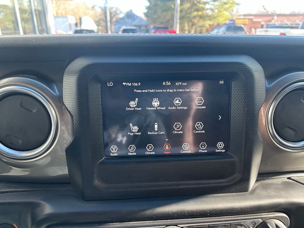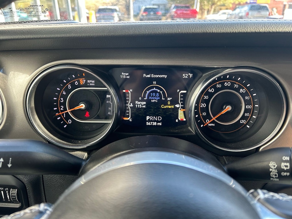 3.45 Rear Axle Ratio, 4-Wheel Disc Brakes, 8 Speakers, ABS brakes, Air Conditioning, Alloy wheels, AM/FM radio: SiriusXM, Anti-Spin Differential Rear Axle, Apple CarPlay, Apple CarPlay/Android Auto, Automatic temperature control, Aux Battery, Black 3-Piece Hard Top, Brake assist, Cloth Low-Back Bucket Seats, Cold Weather Group, Compass, Daytime Running Lamps LED Accents, Delay-off headlights, Driver door bin, Driver vanity mirror, Dual front impact airbags, Dual front side impact airbags, Electronic Stability Control, Freedom Panel Storage Bag, Front anti-roll bar, Front Bucket Seats, Front Center Armrest w/Storage, Front dual zone A/C, Front fog lights, Front LED Fog Lamps, Front License Plate Bracket, Front reading lights, Fully automatic headlights, Garage door transmitter, Google Android Auto, GPS Antenna Input, Heated door mirrors, Heated Front Seats, Heated Steering Wheel, Heavy Duty Suspension w/Gas Shocks, Illuminated entry, Integrated roll-over protection, Integrated Voice Command w/Bluetooth, Leather steering wheel, LED Lighting Group, LED Premium Reflector Headlamps, LED Taillamps, Low tire pressure warning, Manufacturer's Statement of Origin, MOPAR Hardtop Headliner, No Soft Top, Non-Lock Fuel Cap w/o Discriminator, Occupant sensing airbag, Outside temperature display, Panic alarm, ParkView Rear Back-Up Camera, Passenger door bin, Passenger vanity mirror, Power door mirrors, Power steering, Power windows, Quick Order Package 25G, Radio data system, Radio: Uconnect 4 w/7" Display, Rear anti-roll bar, Rear reading lights, Rear Window Defroster, Rear Window Wiper/Washer, Remote keyless entry, Remote Proximity Keyless Entry, Remote Start System, Security system, Speed control, Split folding rear seat, Steering wheel mounted audio controls, Stop-Start Dual Battery System, Tachometer, Telescoping steering wheel, Tilt steering wheel, Traction control, Trip computer, Variably intermittent wipers, Voltmeter, Wheels: 18" x 7.5" Polished w/Gray Spokes.