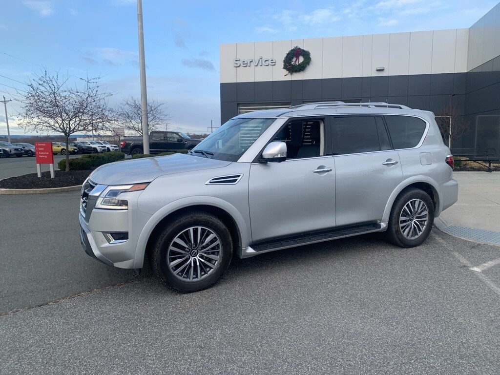 Clean CARFAX. CARFAX One-Owner. 4WD, 13 Speakers, 2.937 Axle Ratio, 3rd Row Carpeted Floor Mats - Bench Seat, 3rd row seats: split-bench, 4-Wheel Disc Brakes, ABS brakes, Air Conditioning, Alloy wheels, AM/FM radio: SiriusXM, Anti-whiplash front head restraints, Auto High-beam Headlights, Auto tilt-away steering wheel, Auto-dimming door mirrors, Auto-dimming Rear-View mirror, Auto-leveling suspension, Automatic temperature control, Brake assist, Bumpers: body-color, Cargo Package, Delay-off headlights, Driver door bin, Driver vanity mirror, Dual front impact airbags, Dual front side impact airbags, Electronic Stability Control, Emergency communication system: NissanConnect Services, Exterior Parking Camera Rear, Four wheel independent suspension, Front anti-roll bar, Front Bucket Seats, Front Center Armrest, Front dual zone A/C, Front fog lights, Front reading lights, Fully automatic headlights, Garage door transmitter: HomeLink, Heated door mirrors, Heated Front Bucket Seats, Heated front seats, Heated steering wheel, HVAC memory, Illuminated entry, Illuminated Kick Plates, Knee airbag, Leather Shift Knob, Leather steering wheel, Leather-Appointed Seat Trim, Low tire pressure warning, Memory seat, Navigation System, Nissan USB Charging Cable Set, Occupant sensing airbag, Outside temperature display, Overhead airbag, Overhead console, Panic alarm, Passenger door bin, Passenger vanity mirror, Power door mirrors, Power Drivers Seat, Power Liftgate, Power moonroof, Power passenger seat, Power steering, Power windows, Radio: NissanConnect w/SiriusXM, Rear air conditioning, Rear anti-roll bar, Rear reading lights, Rear seat center armrest, Rear window defroster, Rear window wiper, Reclining 3rd row seat, Remote keyless entry, Roof Rail Cross Bars - Silver, Security system, Speed control, Speed-sensing steering, Speed-Sensitive Wipers, Split folding rear seat, Spoiler, Steering wheel memory, Steering wheel mounted audio controls, Tachometer, Telescoping steering wheel, Tilt steering wheel, Traction control, Trip computer, Turn signal indicator mirrors, Variably intermittent wipers, Voltmeter, Wheels: 20" x 8J Painted Alloy, 4WD. Odometer is 11174 miles below market average!