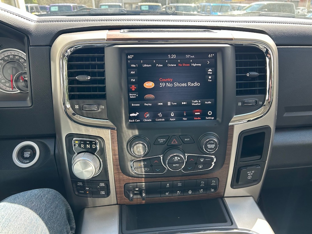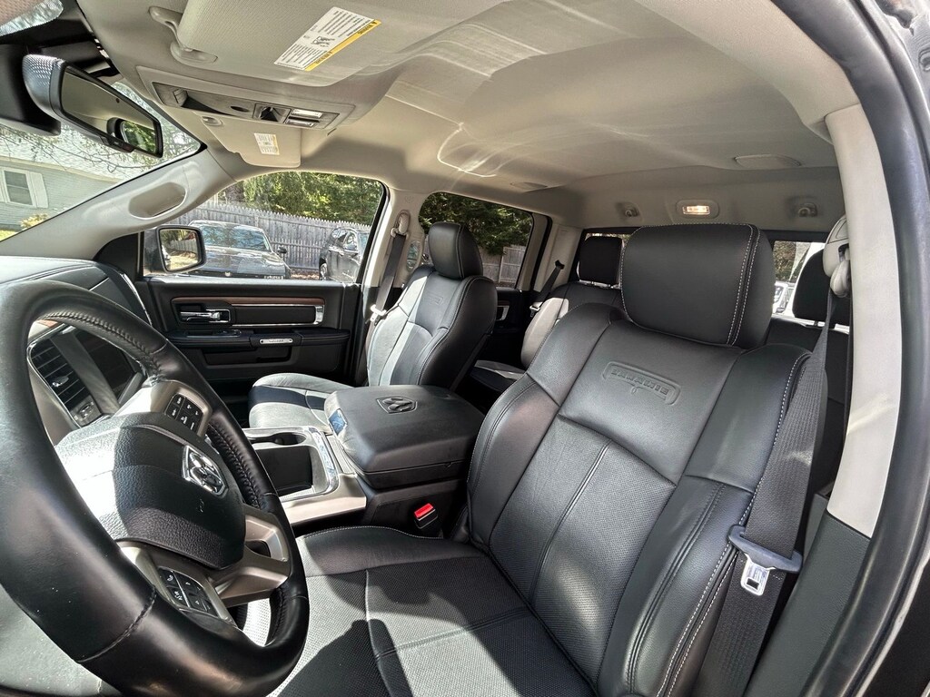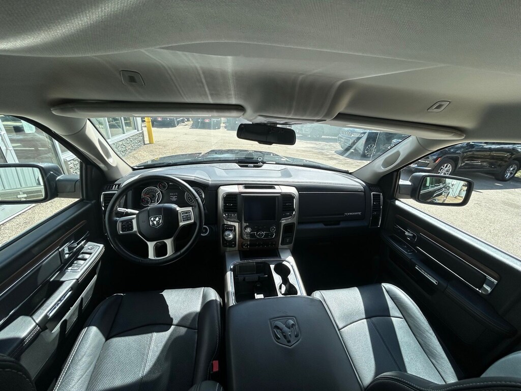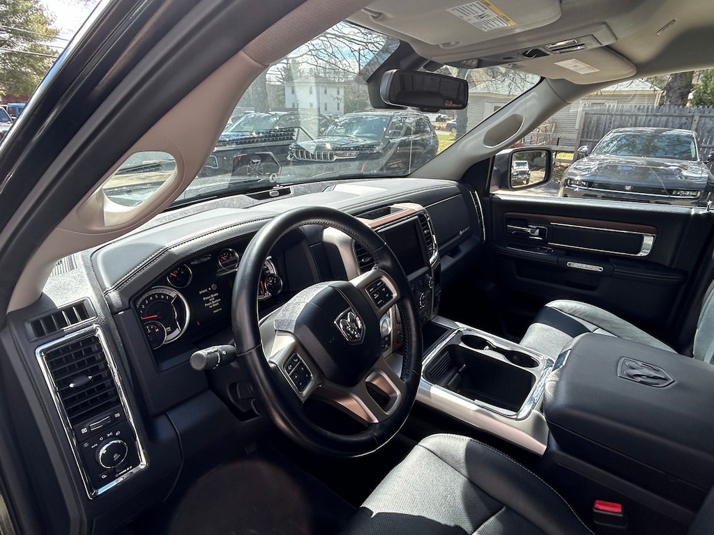 1-Yr SiriusXM Guardian Trial, 115V Auxiliary Power Outlet, 20" x 9" Chrome Clad Aluminum Wheels, 3.21 Rear Axle Ratio, 4-Wheel Disc Brakes, 5-Year SiriusXM Traffic Service, 5-Year SiriusXM Travel Link Service, 6 Speakers, 8.4" Touchscreen Display, 9 Alpine Speakers w/Subwoofer (DISC), ABS brakes, Active Grille Shutters, Adjustable pedals, Air Conditioning, Alloy wheels, AM/FM radio: SiriusXM, Apple CarPlay, Apple CarPlay/Android Auto, Audio Jack Input for Mobile Devices, Audio memory, Auto High Beam Headlamp Control, Auto-dimming door mirrors, Auto-dimming Rear-View mirror, Automatic temperature control, Brake assist, Bumpers: chrome, Center Hub, Compass, Convenience Group, Delay-off headlights, Driver door bin, Driver vanity mirror, Dual front impact airbags, Dual front side impact airbags, Electronic Shift, Electronic Stability Control, Emergency communication system: SiriusXM Guardian, Folding Flat Load rival!Floor Storage, Front & Rear Rubber Floor Mats, Front anti-roll bar, Front Center Armrest w/Storage, Front dual zone A/C, Front fog lights, Front reading lights, Front wheel independent suspension, Fully automatic headlights, Garage door transmitter, Google Android Auto, GPS Antenna Input, GPS Navigation, HD Radio, Heated door mirrors, Heated Front Seats, Heated front seats, Heated steering wheel, High Back Seats, Illuminated entry, Integrated Voice Command w/Bluetooth, Keyless Enter-N-Go, Leather steering wheel, Leather Trim 40/20/40 Bench Seat, LED Bed Lighting, Low tire pressure warning, Media Hub (2 USB, AUX), Memory seat, Occupant sensing airbag, Outside temperature display, Overhead airbag, Overhead console, Panic alarm, ParkSense Front/Rear Park Assist System, ParkView Rear Back-Up Camera, Passenger door bin, Passenger vanity mirror, Pedal memory, Power 10-Way Memory Driver & 6-Way Passenger Seats, Power door mirrors, Power driver seat, Power passenger seat, Power steering, Power windows, Quick Order Package 26H Laramie (DISC), Radio data system, Radio: Uconnect 4C Nav w/8.4" Display, Radio: Uconnect 4C w/8.4" Display, Rain Sensitive Windshield Wipers, Rear 60/40 Split Folding Seat, Rear anti-roll bar, Rear seat center armrest, Rear step bumper, Rear Window Defroster, Remote keyless entry, Remote Proximity Keyless Entry, Remote Start System, Remote USB Port, Security system, SiriusXM Satellite Radio, SiriusXM Traffic Plus, SiriusXM Travel Link, Speed control, Split folding rear seat, Spray In Bedliner, Steering wheel mounted audio controls, Tachometer, Tilt steering wheel, Tip Start, Traction control, Trailer Brake Control, Trip computer, Turn signal indicator mirrors, USB Host Flip, Variably intermittent wipers, Ventilated Front Seats, Ventilated front seats, Voltmeter, Wheel to Wheel Side Steps.